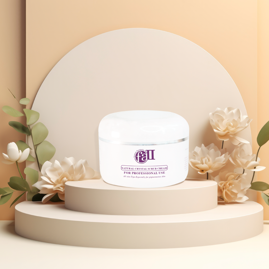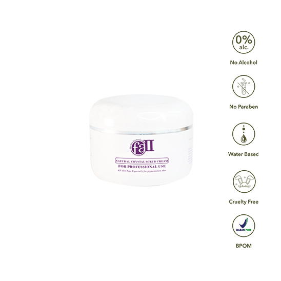 FA-II Natural Crystal Scrub Cream bekerja sebagai scrub wajah yang lembut dan alami yang mampu mengangkat sel kulit mati, memoles kulit dan membuatnya bercahaya sehat alami. Memiliki khasiat menyembuhkan, menenangkan, dan anti-iritasi. Ia mencerahkan bintik pigmen dan warna kulit tidak merata. Ia menahan kelembaban kulit dengan mencegah lepasnya kelembaban atau air.